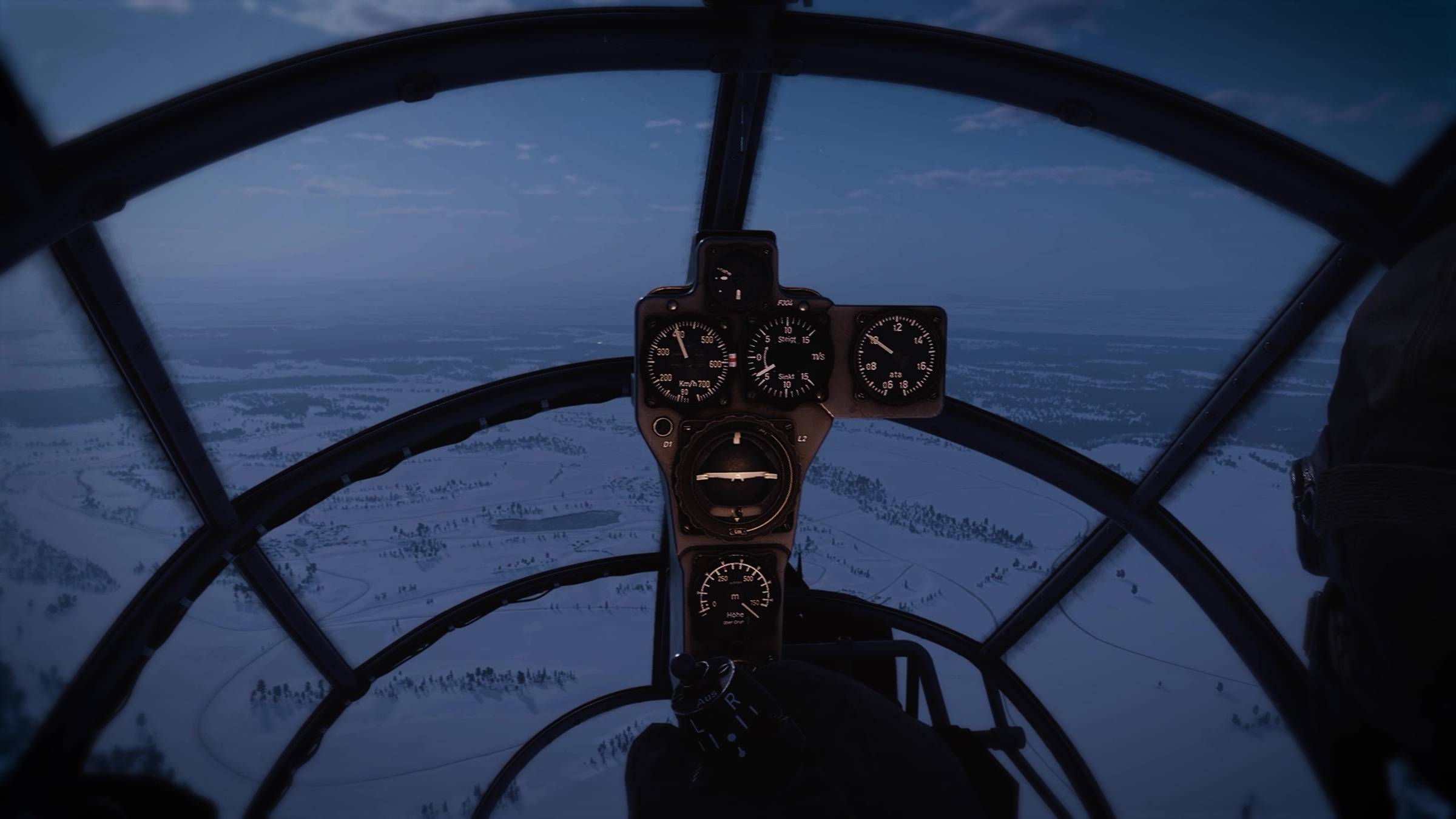 Intense moonlight can be seen on the horizon in this cockpit shot during our recreation of the Battle of the Bulge. In reality, it would have been much darker.